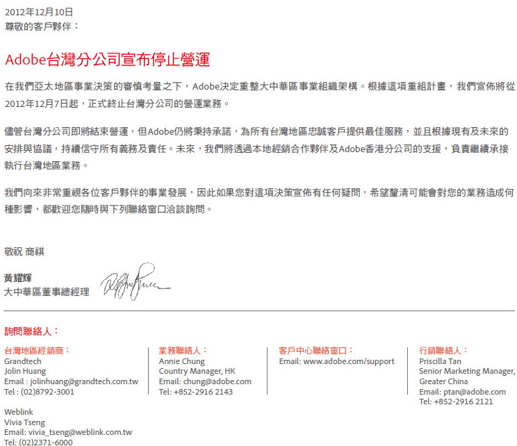 Adobe 日前發出令人震驚的消息:已經正式通知客戶,於 2012/12/7 起正式結束台灣分公司的營運,往後本地的業務交由香港分公司以及台灣經銷商負責。以下便是 Adobe 發出的新聞訊息。