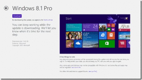首先,您必須先安裝 Windows 8.1 預覽版頁面上的一個小型更新檔,讓 Windows 8 系統可以透過 Windows 市集,直接更新為 Windows 8.1 預覽版。更新檔安裝完成後,您必須重新啟動電腦。之後,一旦 Windows 8.1 正式版開放下載,該更新檔將藉由與 Windows 市集的連結,透過 Windows Update 自動更新您的作業系統。