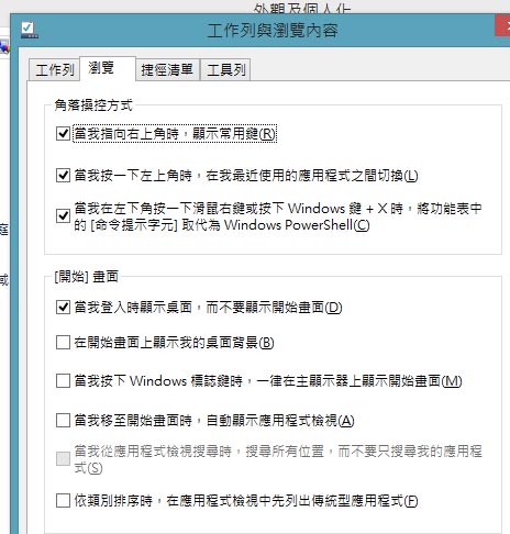 另外,用戶終於也可以在開機後變進入這個桌面,不用再經過動態磚畫面。這可在 "外觀及個人化" 的瀏覽設定中進行設定: