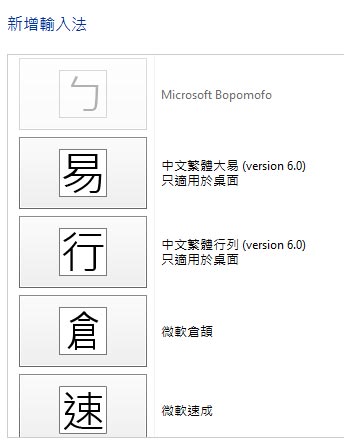 除了注音輸入法外,也加入了大易、行列、倉頡、速成輸入法: