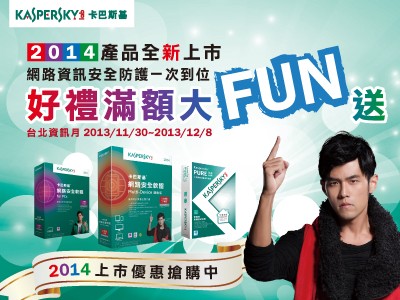 卡巴斯基,2013台北資訊月新品上市,全員到齊攻佔資訊月,一舉滿足全方位領域網路資訊安全防護需求。全新卡巴斯基『2014網路安全軟體旗艦版』是市面上唯一可同時安裝於PC、筆電、Mac、Android智慧型手機及平板電腦5台不同裝置的防護軟體;『2014網路安全軟體for PCs』完美保護您的電腦與個人重要資料;『PURE 3.0』提供頂級電腦資訊安全理想解決方案,為全方位的您提供全面的資訊安全防護。