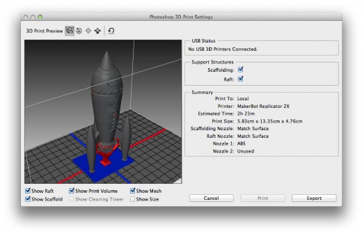 今日發表Photoshop CC後,設計作品將可透過現場連接的3D印表機,或是藉由內建功能連結至熱門網路3D列印服務來製作。Photoshop CC支援最熱門的桌上型3D印表機,如MakerBot Replicator,亦支援3D列印社群與市集Shapeways中的各種高品質素材,包括陶瓷、金屬、各色沙岩等。此外,Photoshop用戶可直接上傳3D模型至Sketchfab 3D列印服務,再運用Sketchfab的互動式3D預覽器,將模型置入他們的Behance個人檔案。