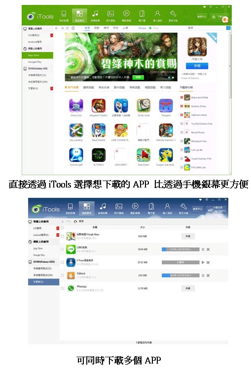 透過與電腦連線,iTools還可以在電腦端下載大量APP,用戶不用被限制在小銀幕前一一選擇要下載的項目。更棒的是,會員還享有系統推薦的應用程式,找到合適自己需要的APP全不費工夫。