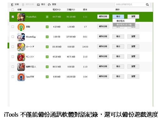 iTools可以進行應用程式的安裝、備份與卸載,且備份相當快速。