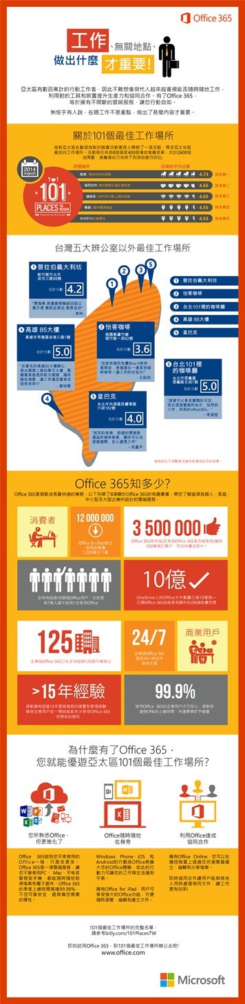 今年3月微軟在亞太地區國家的臉書專頁上舉辦「最佳101工作地點」推薦活動,吸引來自8個國家400個場地推薦名單,共計2600個投票數,票選結果發現氣氛(場地特色和氛圍活動)、協同合作(適合開會討論的適宜度)及連結性(WiFi或行動上網的品質)是消費者遴選最佳工作地點的標準前三名。