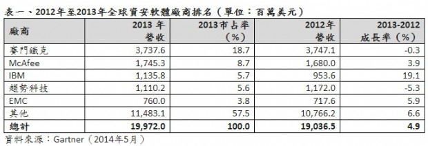 國際研究暨顧問機構Gartner表示,2013年全球資訊安全軟體營收總計199億美元,較2012年的190億美元成長4.9%。成長率低於預期的原因為重要子領域市場的普及化,以及前五大廠商中就有二家成長減緩。