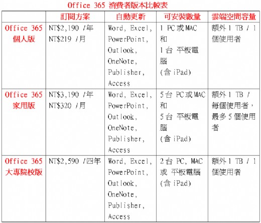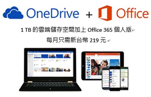 繼今年四月份宣布Office 365企業版用戶每人可享有1 TB雲端儲存空間後,微軟再度為其他Office 365用戶提供更好的服務:Office 365家用版 (320元/月,3,190元/年) 用戶每人可獲得1 TB容量 (最多5人) ;Office 365個人版 (219元/月或2,190元/年) 和大專院校版 (2,590元/4年) 的用戶,每人也能享有1 TB的雲端儲存空間。