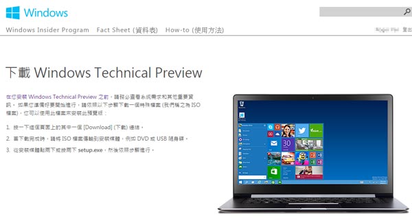 微軟官網已經正式提供 Windows 10 技術預覽版 ISO 安裝檔案供用戶下載使用,有興趣的網友可到下列網址進行下載(要先加入 Windows Insider Program):