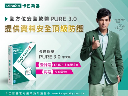 卡巴斯基全方位安全軟體PURE3.0提供個人電腦所需資料安全防護,即時雲端防護針對最新的惡意軟體威脅與網路威脅提供有效保護。獨家的「Safe Money」安全技術,保護消費者網路購物、線上金融交易安全,免受惡意人士竊取利用。貼心的「家長監控」功能隨時留意孩童瀏覽網頁、收發電子郵件、下載檔案、使用社群網站等上網安全,輕鬆管理電腦使用與上網時間,建立安全無虞的網路環境。即日起至12月31日止,凡購買卡巴斯基全方位安全軟體PURE3.0全系列產品,即享「好運連3」限時特惠活動。現在買就送Android智慧型手機防護180天、Android平板電腦防護180天與MAC電腦防護180天等三大防護禮。上網登錄再送PURE3.0一台電腦一年版兩套與泰騰恩時尚馬卡龍行動電源。全系列產品於燦坤、順發、三井、全國電子等3C連鎖通路及全台經銷門市、卡巴斯基官方網站、PChome、Yahoo、AUTOBUY與momo網路購物熱烈銷售中!