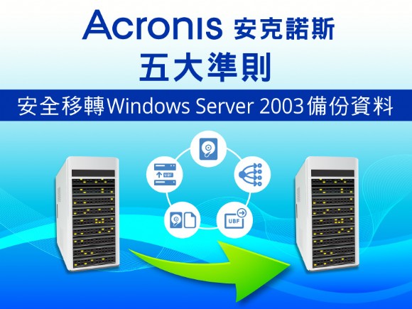 資料備份與災後復原專家 – Acronis(安克諾斯),為幫助企業降低資料在移轉時可能遭到損毀及遺失的風險、節省所需人力成本與減少操作新系統可能出現的問題,提出五大安全準則,協助企業客戶順利在今年7月14日微軟終止支援Windows Server 2003前,以簡單、快速、安全的方式移轉伺服器資料,持續營運不中斷,保持企業競爭優勢。