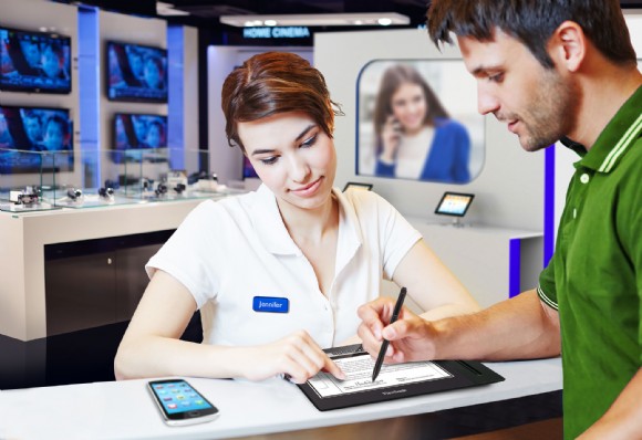 ViewSonic 全新系列電磁筆顯示器正提供電信業一個最佳無紙化電子簽章解決方案,其採用 EMP 技術,不僅讓客戶能直接在螢幕上查看完整電子文件,更可以使用無電源式電磁筆,直接在螢幕上完成表單資料填寫、文件簽署及儲存,客戶簽名仍能精確依照個人筆跡輕重粗細重現螢幕,有如傳統紙本手寫的真實細膩筆跡。