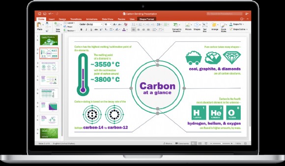 PowerPoint for Mac ─ 更進化的PowerPoint「簡報者模式」 (Presenter View) 讓使用者在簡報時享有完全的控制權,當使用在簡報時,Mac 電腦螢幕上會呈現目前的投影片、下一張投影片、備忘稿及計時器,而觀眾只會在大螢幕上看到簡報者正在簡報的投影片。新的「動畫窗格」 (animation pane) 能協助使用者設計及調整動畫,且最新的「投影片切換」能為使用者的簡報內容增添效果。