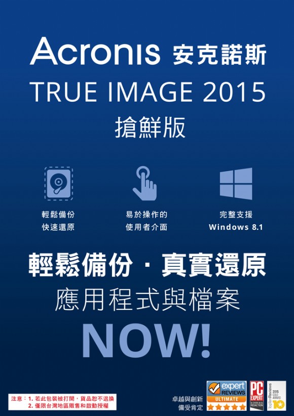 資料備份與災後復原專家 - Acronis安克諾斯一項調查顯示,有1/4的硬碟可能會在三年內故障,為避免照片、音樂、影片、文件等個人重要資料因硬碟無預警故障而遺失,提醒消費者應選擇易於操作的軟體並定期備份資料。Acronis安克諾斯台灣總代理 - 湛揚科技正式在台推出Acronis True Image 2015搶鮮版,提供單鍵還原技術,可在電腦進入作業系統前,透過按下鍵盤上的F11快速鍵進入救援程式,對電腦進行備份與應用程式復原的設定。即日起至8月31日止至泰騰恩商城購買Acronis True Image 2015搶鮮版(市價490元),即享上市超值促銷價299元,購買Acronis全系列產品再享加購價199元,輕鬆備份、即時復原,全面保護電腦上的所有檔案內容以個人資料安全。