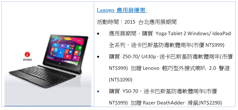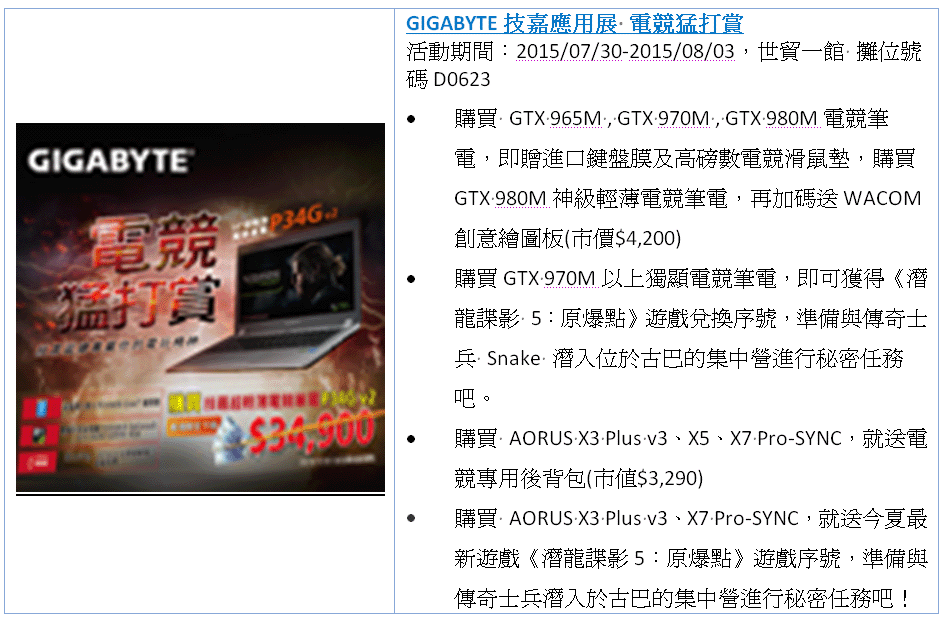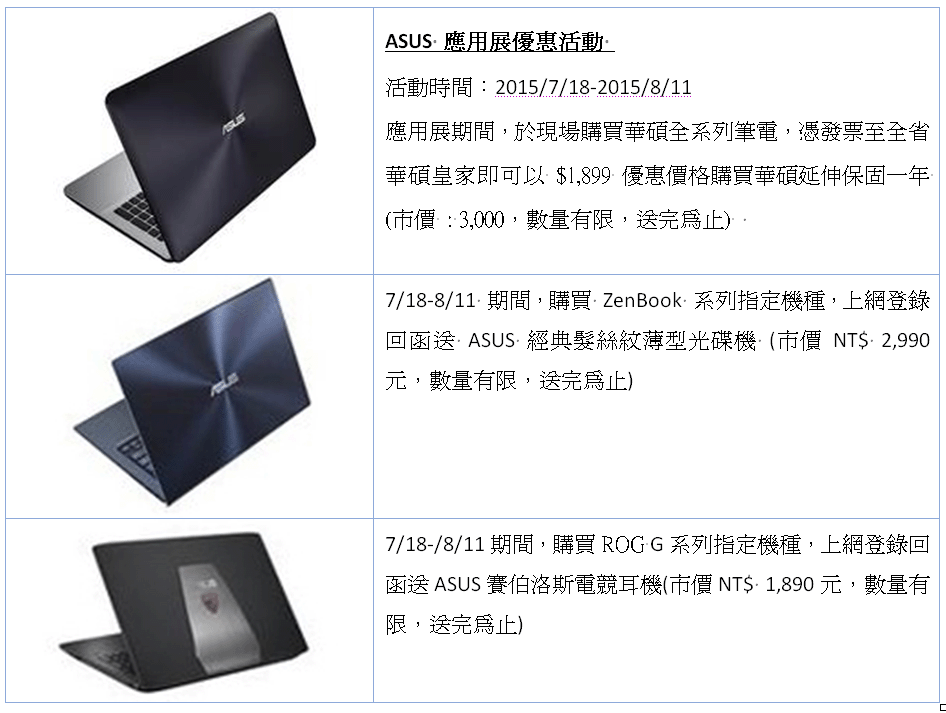 宏碁、華碩、戴爾、技嘉、惠普、聯想、及微星等電腦品牌紛紛祭出購機優惠及好禮加碼送,最高有機會獲得價值新台幣33000元的東京電玩展自由行套裝行程,各家祭出的優惠如下: