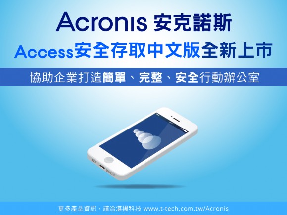 Acronis安克諾斯台灣總代理 – 湛揚科技為滿足現今企業行動商務(BYOD)的需求,推出全新Acronis安克諾斯 Access Advanced安全存取解決方案繁體中文版,確保員工無論是在企業環境內外透過行動裝置包含筆記型電腦、Mac、智慧型手機或平板,能夠安全存取、同步與共享重要資訊,提供更簡單易用、完整保護、絕對安全存取所有檔案與內容,保障企業營運機敏資料的安全。