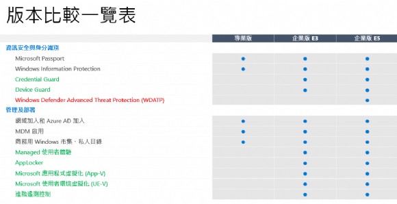 Windows 10專業版、Windows 10 企業版E3、Windows 10 企業版E5的比較一覽表如下: