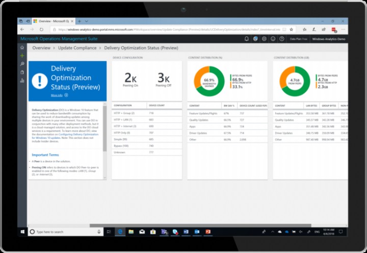 智慧桌面是由Windows 10和Office 365 ProPlus組成。為管理智慧桌面而生的傳遞最佳化 (Delivery Optimization) 功能將在Windows 10更新 (2018年四月版) 中來到。傳遞最佳化將允許單一裝置下載更新,並透過內部網路將該更新遞送給其他裝置,這將大幅降低9成的頻寬佔用。透過本次更新,IT將可透過傳遞最佳化監看有多少裝置已完成更新、節省多少頻寬消耗;同時,Application Health Analyzer (AHA)工具的公開預覽版也將於下個月發布,可協助評估與確保內部開發應用和Windows 10的相容性。