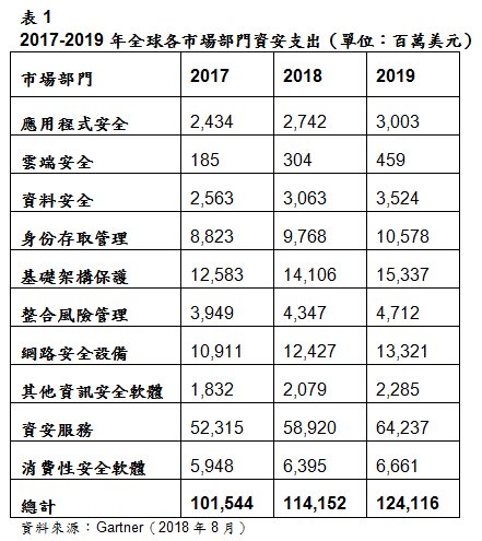 Gartner 預測,2018年全球在資訊安全產品及服務支出的費用將超過1,140億美元,較去年增加12.4%;預計2019年市場將持續成長8.7%,達1,240億美元。