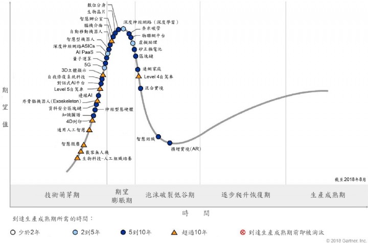 Gartner公布2018年新興技術發展週期報告(Hype Cycle for Emerging Technologies, 2018,見圖1),從35種必須關注的技術中,發現未來將模糊人類與機器之間界線的五大新興科技趨勢-AI大眾化、數位化生態系統、DIY生物駭客、透明沉浸式體驗、無所不在的基礎架構。例如人工智慧(AI)就扮演了關鍵角色,讓企業能夠無所不在,隨時提供服務並連結商業生態系統,才能在未來市場繼續生存。