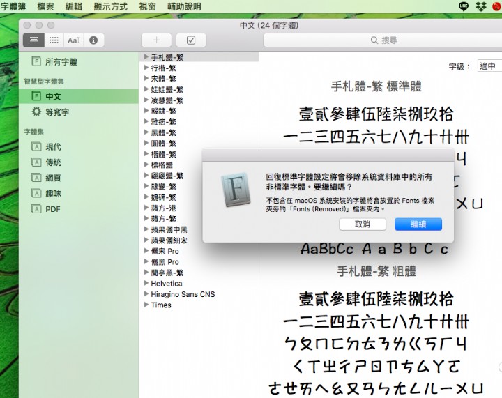 如果想避開上述的字型地雷,除了向字型公司購買授權外,設計/開發者也可考慮網路上免費的開源字型,像是 Google 在四年前發表的 [思源字體]。另外,要給 Mac 用戶宣布一個好消息,因為所有 Mac系統預設安裝的中文字型都可用於其他商業用途(當然不能把人家整個字型拿去轉賣)。(下圖,由 Mac 字體簿回復標準字體後可看到所有預載合法的字型)