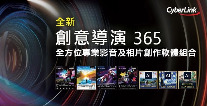 訊連科技隆重推出全新「創意導演 365」雲端訂閱式服務,提供數位內容創作者功能齊全、更具彈性且更超值之影音創作解決方案。「創意導演 365」集結最新版之威力導演 17、相片大師 10、AudioDirector 8 及 ColorDirector 7 等四套旗艦創作軟體; 更收錄無限量擴充內容和套件,以及大容量 100 GB 雲端儲存空間,輕鬆滿足 YouTuber、Vlogger 及專業影音玩家功能更強大且彈性化的創作需求。