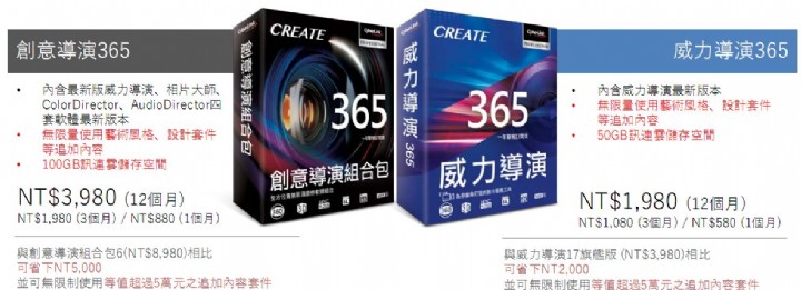 CyberLink 訊連科技今日正式發表雲端訂閱式服務「創意導演 365」,仿照 Adobe CC 的月租或年租方案,但價格更具有競爭力。全套餐型的「創意導演365」年租只要不到四千元台幣,包括了威力導演 17、相片大師 10、ColorDirector 7、AudioDirector 9、無限量訊連科技專業創作外掛插件、特效、設計套件以及 100GB 大容量訊連雲空間,可說相當實惠。而經濟型套餐「威力導演365」只針對威力導演17與插件特效以及 50GB 雲端空間,年租不到兩千元。另外也可買斷威力導演 17 ,旗艦版售價 NT$3,980。以下便是訊連新聞稿全文。