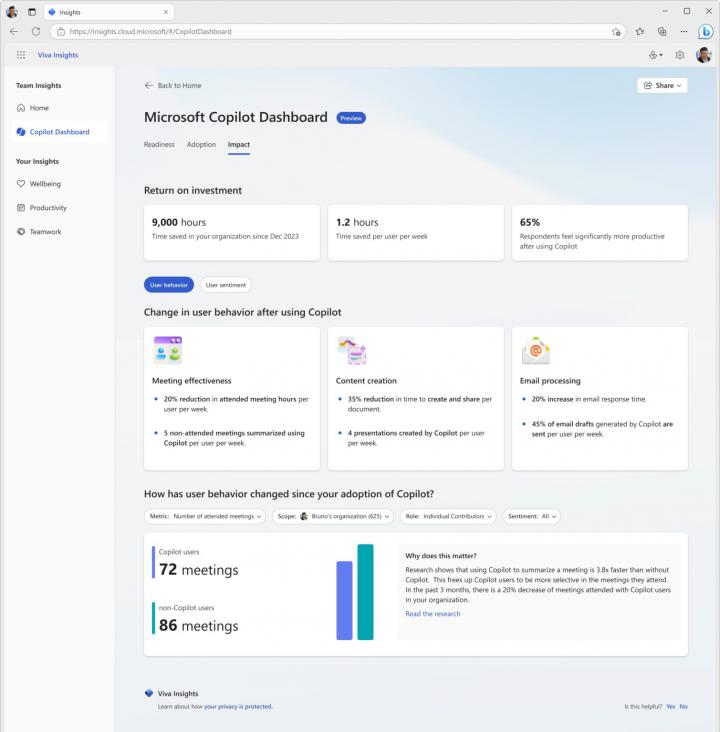 ‧ 打造嶄新 IT 管理模式,便於企業導入追蹤:Microsoft 365 管理中心整合 Viva 中的數據提供 Copilot for Microsoft 365 使用報告,協助企業輕鬆規劃與追蹤員工使用情形。透過儀表板數據分析,亦能依據員工使用 Microsoft 365 應用程式之情況,提供管理者評估、追蹤、計算使用成效,提升用戶使用效能。