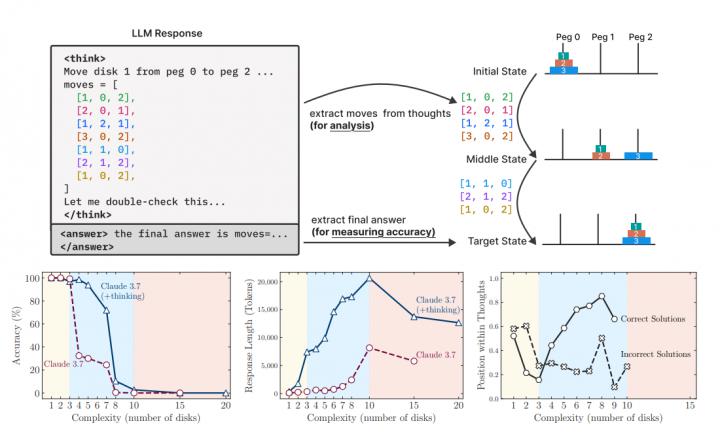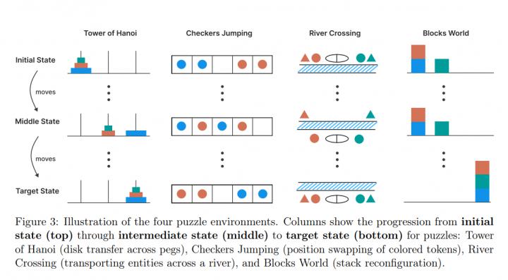 大型推理模型(Large Reasoning Models, LRM)透過 Chain of Thought(CoT)與自我反思機制,在多項推理題上取得突破。然而,當題目複雜度超過某一臨界點,LRM 仍會「思考崩潰」。在作者自建的四款可控謎題中(河內塔、跳棋交換、渡河難題、積木世界),所有前沿 LRM——含 o3 mini、DeepSeek R1 及 Claude 3.7 Sonnet Thinking——都呈現以下共通曲線: