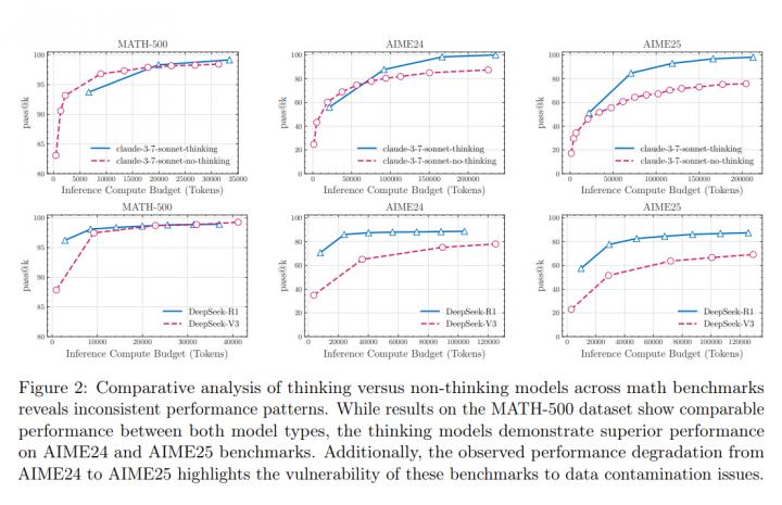- 思考 token 反轉:Thinking 版在複雜度升高初期會將思考長度由 ~5 k 逐步拉高到 ~18 k,但一旦接近臨界點,平均思考 token 反而降回 ~10 k,且仍遠低於 64 k 上限。