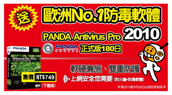 活動內容如下,消費者只要在全省3C門市或線上購買corega指定型號寬頻分享器,認明彩盒上專案促銷貼紙,即可取得市價749元的Panda Antivirus Pro 2010正式版180日免費下載序號,於2010年9月底前開通都有效,詳情請至官網或來電客服專線查詢。