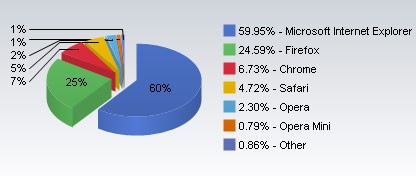 根據 NetMarketShare 調查,IE 瀏覽器在 2010年四月份的使用率只剩 59.95%,不到六成。而 Firefox 火狐則為 24.59%,達約 1/4 使用率。其他熱門瀏覽器還有 Google Chrome、Safari、Opera 等。