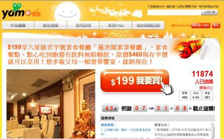 yam蕃薯藤破了史上《揪》團銷售紀錄!2010年12月21日中午12點準時在《揪便宜》上檔的「蓮池閣素菜餐廳」,下殺43折,原價$460的素食餐點吃到飽,現在只要平價$199元就可輕鬆享用,吸引超過1.1萬人瘋狂搶購,創下《揪》團史上銷售人數及金額雙雙破表的驚人紀錄!