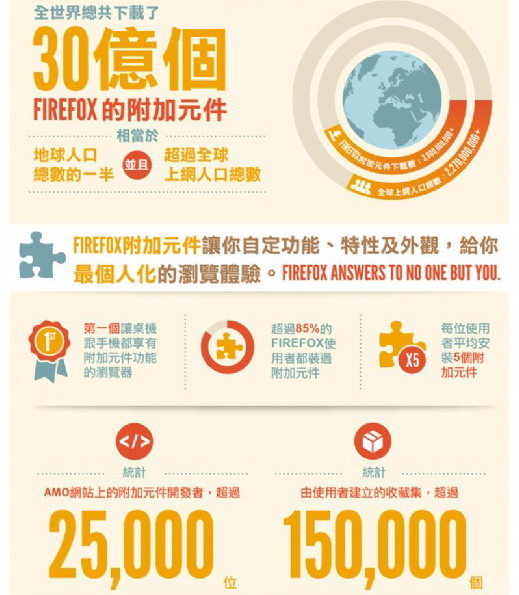Firefox 感謝全球數百億名使用者,以及超過25,000名的Firefox 附加元件開發者,Mozilla 獻上(附件)紀念圖表,紀念由你我共同創造的 Firefox 附加元件里程碑!