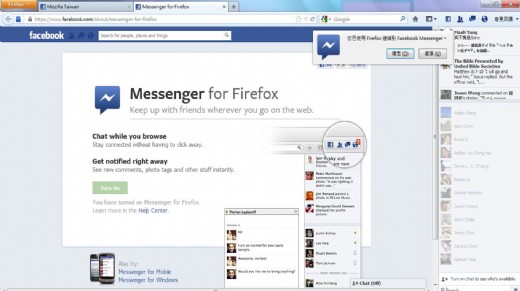 Firefox 很高興展示 Social API 在社群整合上的第一步:Facebook 即時通,歡迎搶先下載/更新最新 Firefox 版本,接著至 Facebook Messenger for Firefox page 頁面並點選「開啓」就可立即體驗!