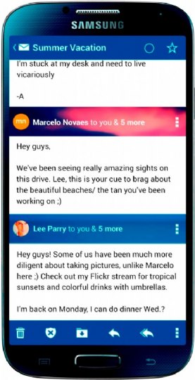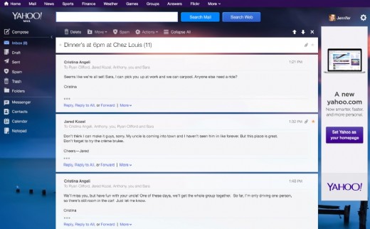 重新設計的Yahoo電子信箱,更具效能,使用者只要將游標停留在電子郵件上,搜尋、標記、刪除等常用功能均可一步完成;並可藉由收合左側工具列,擁有更多留白空間,更加專注於眼前的工作。為符合以串連方式閱覽電子郵件的需求,新版Yahoo電子信箱提供全新的對話串功能,讓使用者一次瀏覽所有往來對話,掌握前因後果,省時省力。