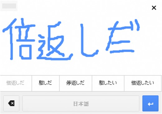 使用者只要點選Gmail與Google文件上方工具列中的「鉛筆」圖示,就可以輕易切換到手寫模式,用滑鼠或是觸控板寫出中文、日文等多達20種以上的多國文字。想在Gmail或Google文件文件中寫出,在台灣早已紅透半邊天《半澤直樹》經典台詞「以牙還牙!加倍奉還!!」的日語原文,卻發現鍵盤中沒有日語輸入法嗎?或者是,經常有些中文字知道怎麼寫,透過鍵盤卻怎麼也打不出來嗎?到底是『「ㄋㄥˊ」然』、『「ㄌㄥˊ」然』還是『「ㄖㄥˊ」然』呢?透過Google多國語言手寫功能的支援,以上煩惱將迎刃而解。