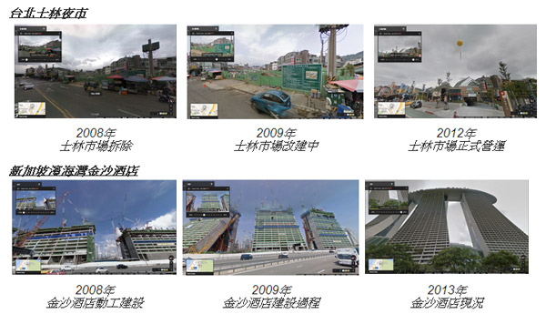 Google街景時光機中收錄了全球各大城市及景點的變遷歷史與更新過程,如台北士林夜市從2008年開始更新重建、到2012年正式投入營運的整個過程,都可以透過Google街景時光機一窺實景。而新北市的新板特區,過去6年內在「四鐵共構(高鐵、臺鐵、捷運、客運)」的交通優勢加持下,以驚人的速度成長,成為新崛起的都會型商圈,街景時光機同步見證了板橋的更新腳步。國際上眾多知名景點的建設過程也都收錄在這次的更新中,像是偶像劇《我可能不會愛你》中大仁哥下榻的新加坡濱海灣金沙酒店、日本東京新地標晴空塔、或是紀念911事件的紐約世界貿易中心一號大樓。