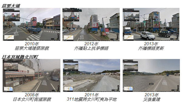 除了都市地景的改變,Google街景時光機還能帶領使用者了解全世界重要事件的發展過程。像引起社會大量關注的苗栗大埔事件,2010年一月原本平凡的民宅,到2012年後已在建築外觀陸續貼上各種斗大、聳動的抗爭標語,而未來不論苗栗大埔事件後續如何發展,也都將詳實地透過Google街景的拍攝鏡頭完整記錄。在國際方面則有日本宮城縣的女川町,在311大地震中幾乎被夷為平地,原本的商店街一夕之間消失殆盡,怵目驚心的街景影像也如實呈現自然災害的巨大力量。而接下來即將在巴西舉行的2014年世界盃足球賽也在過去幾年中如火如荼地展開新競賽場館的翻新與建設,卡斯特勞體育場從舊變新的過程記錄也為全世界的足球迷們揭開新場地建設的神祕面紗。