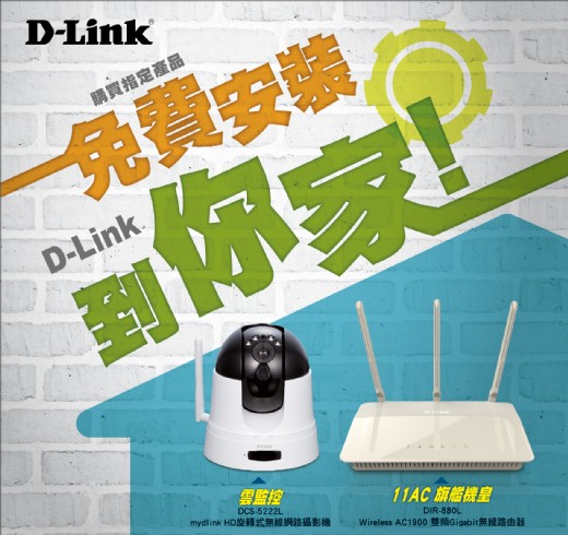 「D-Link免費安裝到你家」活動搭配指定型號產品為DIR-880L 11AC旗艦機皇雲路由及DCS-5222L熱銷百萬畫素旋轉式雲監控,兩款皆屬D-Link高階長銷熱門產品。消費者於活動期間2014年10月1日至2014年12月31日內購買上述兩款產品,憑購買型號、產品序號、發票資料(發票日期需於活動期間內)、發票影本(需上傳),於2015年1月15日前至D-Link友訊科技官網會員中心http://www.dlinktw.com.tw/member/index,登入/加入會員後,點選參加會員回饋活動,填具資料完成活動報名並由D-Link審核無誤後,即可獲贈D-Link授權專業廠商免費到府安裝服務,施工將於2015年1月22日前完成。