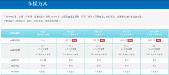 Zoom的營運模式為SAAS(Software as a service),採目前主流的Freemium model。使用 Zoom 多人(視訊)會議室服務,只需「安排或召開會議」者的帳號,選擇最合適的會議室容量(包含10人,25人,50人或100人),付費成為Pro帳號即可,其餘「參加會議」者無需再付費!最便宜的10人會議室,一個月只要台幣199,而最大100人容量的會議室,一個月也只要台幣1489,不到目前市面上視訊會議服務售價的1/10,若使用Basic的免付費服務,每次會議時間為40分鐘,若會沒開完,可再召開新的會議室(不同的會議ID),繼續開會!