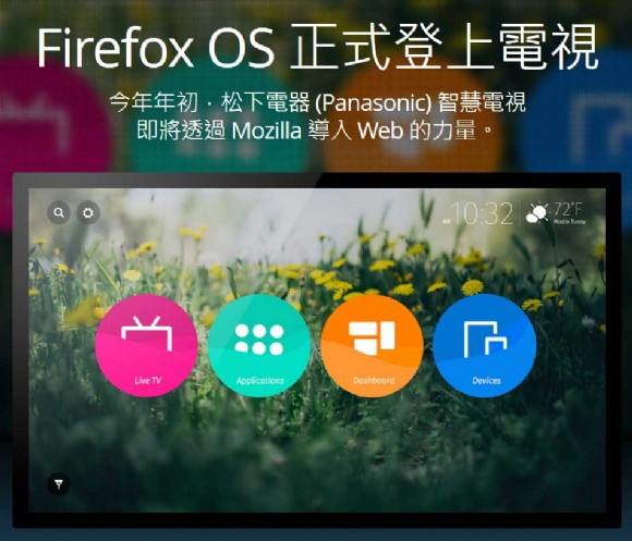 Mozilla 與 Panasonic 合作,以 Firefox OS 打造創新、互動、可自訂的使用者介面,並將於今年春季現身於Panasonic 新款Life+Screen 智慧電視上。透過此次合作,Panasonic 在 2015 年的電視使用者介面將大幅躍進,讓使用者更能輕鬆取得自己最愛的內容,包含網站、電視節目、應用程式,以及其他裝置上的內容。這同時也是 Panasonic 智慧電視首次搭載 Firefox OS ,代表電視螢幕將顯示應用程式所推播的通知,而未來更將擴及各種相容連線裝置的推播通知。