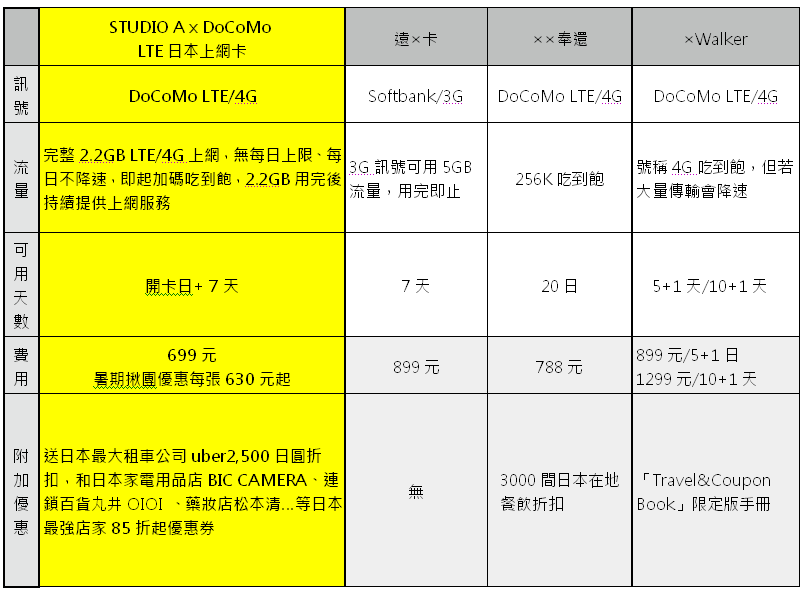 STUDIO A×Docomo日本無線上網卡即日起更加碼升級,7天上網吃到飽(除可享原有7天完整2.2GB LTE高速上網外,超過2.2GB仍可持續提供上網服務,再送日本最大租車公司uber2,500日圓折扣,和日本家電用品店BIC CAMERA、連鎖百貨丸井OIOI、藥妝店松本清…等日本知名店家85折起優惠券(註),另可搭配日本8%退稅新制,使用者只要掃描指定QR code,即可連結到網頁下載各店家虛擬折價券,於結帳時出示即可享優惠,每人每卡每間店限用一次。