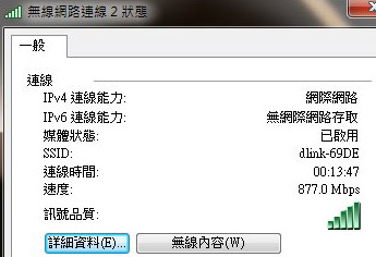 A 電腦距離路由器較遠訊號稍差時,也可抓到 877Mbps: