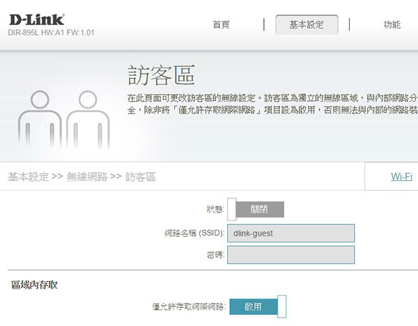 除了正常的 Wi-Fi 基地台功能外,DIR-895L 也可切出專供訪客的區段,只提供有限的上網功能,讓達成分享的同時又能確保區網內的資安: