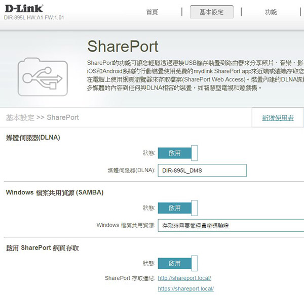 也可啟用 DLNA, SAMBA, SharePoint 功能: