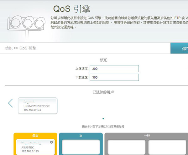 QoS 流量管制則使用簡單明瞭的圖形操作拖拉就可達成: