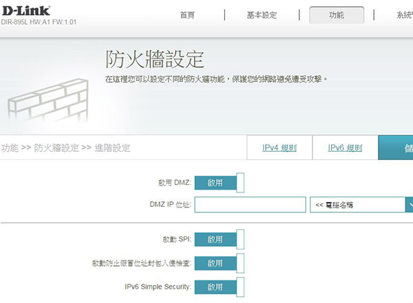 進階的防火牆設定可啟用 DMZ,SPI, 封包檢查等功能: