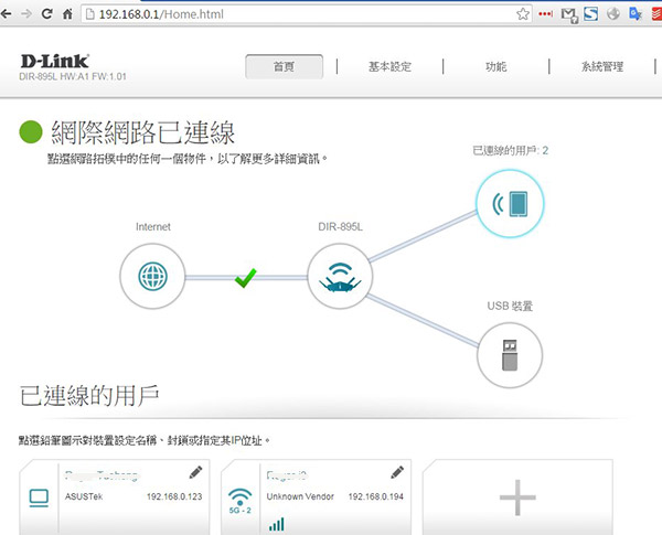 如果在 DIR-895L 後方接上 USB隨身碟或行動硬碟,也會出現在上圖的網路拓樸圖中。