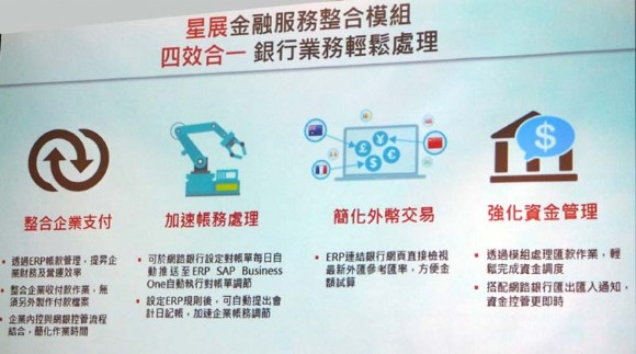 中華電信一直是陪伴台灣中小企業成長的最堅實夥伴,許多中小企業經常遇到「希望導入ERP系統卻擔心必須付出高額成本」的困擾,而中華電信將大型企業常用的營運管理系統,以月租模式提供給中小企業,讓中小企業可利用中華電信雲端機房,省去自建機房、系統維護、電力、空間等大額投入成本,以月租方式輕鬆的享有「SAP HANA高速雲端運算」、「彈性客製化與整合性」、「完整且強大ERP功能」。此次更與2015年榮獲《歐元雜誌》「全球最佳數位銀行」的星展銀行合作,結合金融服務與雲端ERP服務,提供客戶完善的整合式優質服務,可大幅提升企業營運效能及企業競爭力。