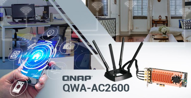 QNAP 首度推出 PCI Express (PCIe) 無線網卡 QWA-AC2600,讓無線網路部署更簡便有彈性,為無線應用帶來更多可能。QWA-AC2600 搭載 2 組 Qualcomm QCA9984 網路介面控制器 (Network Interface Controller, NIC),具備 2.4/5 GHz 雙頻同步多工 (Dual Band Dual Concurrent,DBDC) 功能,且為 4 x 4 的 MU-MIMO (Multi-User MIMO) 網卡,傳輸速率最高可達 2533 Mbps。